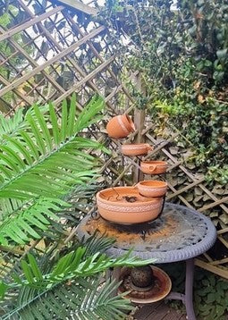 This attractive solar powered water feature cascade has a terracotta jug, 3 pouring bowls and a basin. No mains electricity required. The solar panel creates electricity that powers the small pump, that moves the water to the top jug, from where it trickles down back to the basin. A great water feature for decking, patios and conservatories.